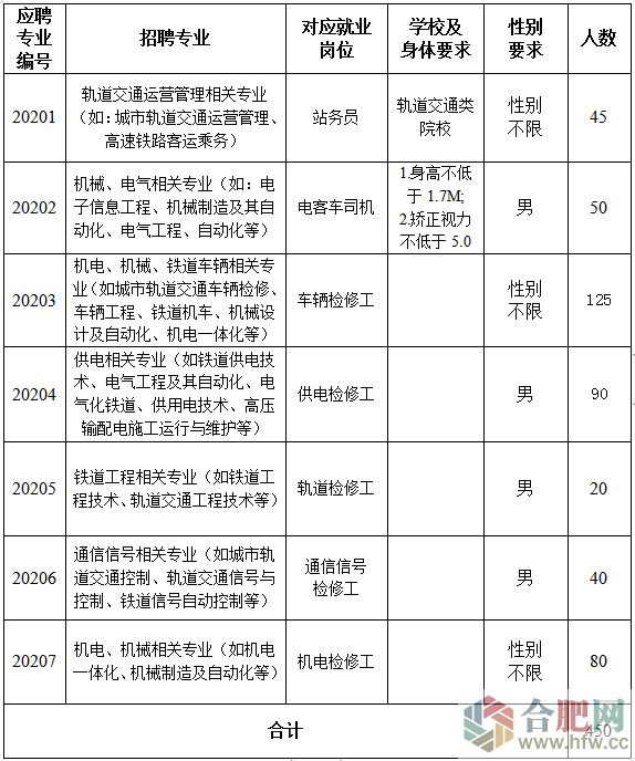 根據合肥市軌道交通建設及運營需要,現合肥市軌道交通集團有限公司運營分公司公開招聘2020屆軌道交通類院校相關專業全日制大專及以上學歷應屆畢業生450人。