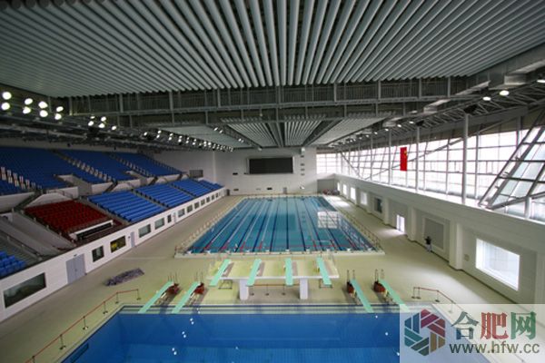 安徽合肥體育中心游泳跳水館是安徽合肥體育中心“一場兩館”構成之一,建筑面積2.5萬㎡。游泳跳水館建筑層數為地上三層、地下一層(有一夾層),主體為鋼筋混凝土框架抗震墻結構,屋頂為鋼折板網架結構,抗震設防裂度7級,建筑耐火等級2級,停車數40輛(其中包括8個大車位),建筑耐久年限二級(50-100年),設計容納觀眾3100余人。游泳跳水館二層以上外墻均為幕墻體系,采用多棱體造型,與體育館造型相互呼應,并有自身個性。首層采用干掛花崗巖石質外墻,形成堅實的基座感,并與二層以上玻璃幕墻形成強烈的虛實對比立面效果。此館外部造型猶如紙折飛機,形成了躍躍欲試沖向藍天的藝術效果,不僅與綜合體育館和主體育場的建筑藝術協調一致,更形成了自己的獨特形象。按大型甲級游泳跳水館設計,可滿足游泳、跳水、水球、花樣游泳等國內重大比賽及國際單項比賽要求。館內比賽場地分為東西兩部分;西側跳水池為25×21×6m,設3m、5m、7m、10m跳臺和1m、3m跳板,東側游泳比賽池為25×50×3m,兼顧考慮花樣游泳、水球比賽的要求?磁_下設計有12.5×50×1.35~1.65m熱身訓練池,集約了建筑體量。游泳跳水館水處理系統采用了循環過濾水質處理器,池水達到室內水質標準,在水質處理器上安裝了板式加熱器,分別可以利用蒸汽加熱和中央空調機組產生的熱量對池水進行加溫,一年四季均可供訓練比賽使用。泳池采用了高檔無菌地磚和加熱系統,有效增強了運動員的舒適感。比賽區和訓練區分別裝有面積為86㎡的電子彩色顯示屏和36㎡的雙基色顯示屏,可以顯示計時計分數據,準確記錄運動員的比賽成績。整個計時計分系統和全館的音響系統采用國際高端產品,并設置了水下揚聲器。游泳館看臺為單邊設計,分上、下兩層,觀眾席3173個,其中貴賓席80個,位于看臺中央,記者席60個,位于貴賓席右側。