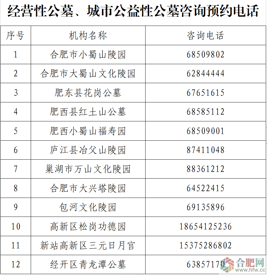 合肥市民政局也提倡廣大市民進行網(wǎng)上祭掃或自行聯(lián)系各殯葬服務機構代為祭掃。如有市民確需到現(xiàn)場祭掃請?zhí)崆巴ㄟ^各陵園、公墓電話及微信公眾號咨詢預約,無預約不得現(xiàn)場祭掃。部分陵園預約方式