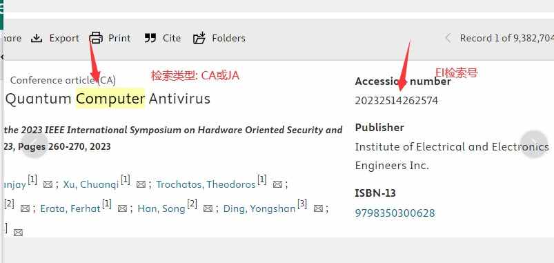 3、需要注意的是,查詢完后需要點標題查看文章詳情,Accession number就是我們需要查找的EI檢索號,例如:Accession number: 202**514262574